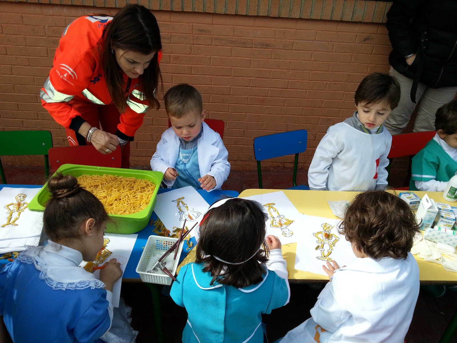 Además de los talleres deportivos y sobre las Olimpiadas que organizaron LOS CABALLOS, también hubo otras actividades: LOS SOLES, organizaron talleres de "médicos", donde podían curarnos, hacer esqueletos con pasta, y marionetas muy divertidas. LAS CROQUETAS, y sus talleres de "policías y bomberos" nos enseñaron a hacernos carnets de policía, unos gorros muy culos de polis, un circuito de cochecitos de juguetes e invitaron a un furgón y dos motos de la Guardia Civil (además un helicóptero del mismo cuerpo nos saludó desde el cielo y se acercó un montón!!!!). LOS FANTASMAS y sus "cocineros" nos invitaron a hacer pasta de sal y formar galletitas, elaboraron gorros de cocineros con sus delantales, hicieron una sopa de letras gigante y colorearon utensilios de cocina. En la clase de LOS DELFINES, pudimos pintar con caballete, hacernos instrumentos musicales o pintarnos la cara como unos buenos "artistas"; y finalmente, en la clase de LOS OSITOS, donde trabajaron "el mercado", hicimos estampaciones con patata, brochetas de fruta e incluso nos pudimos fotografiar "disfrazados" de frutas.